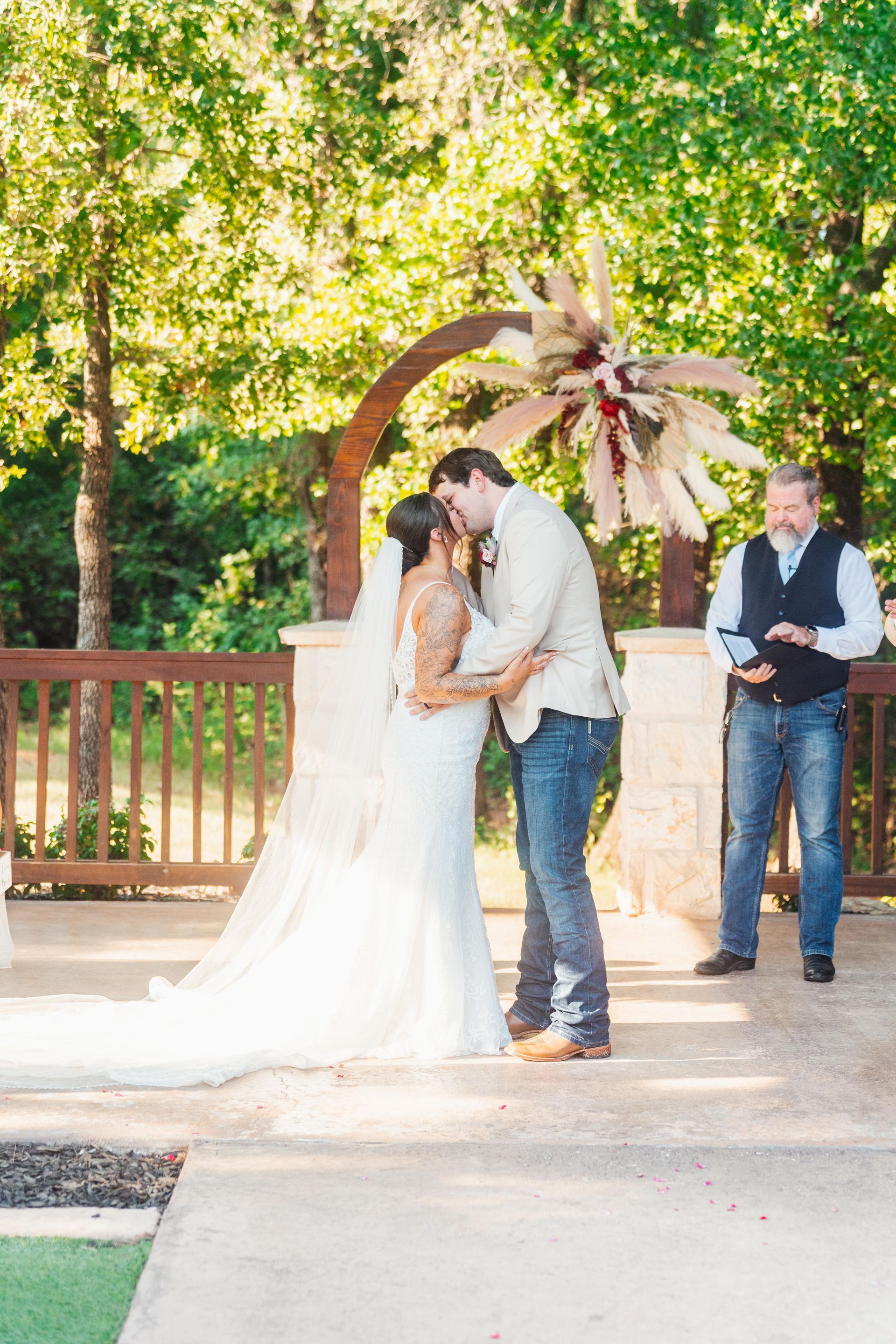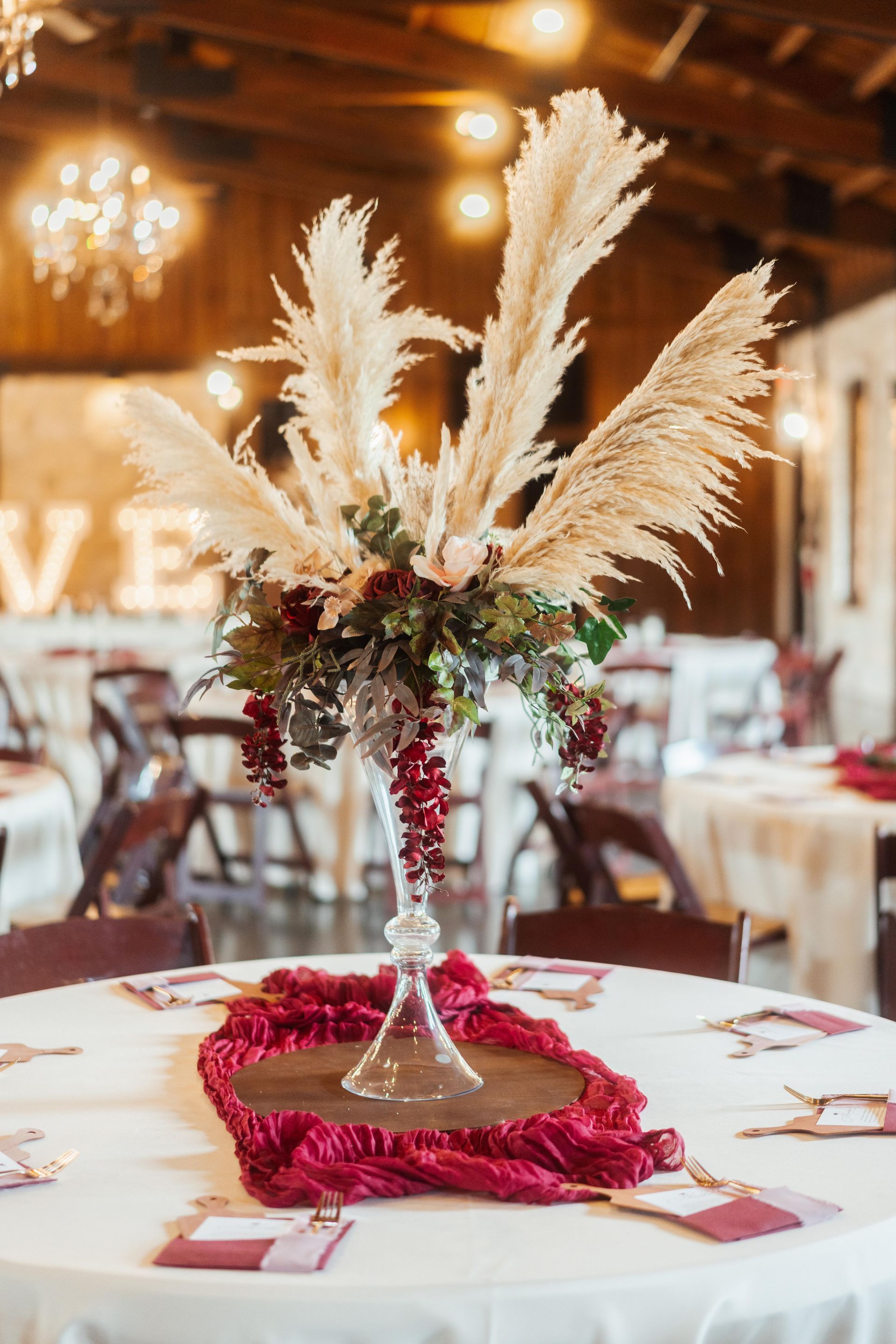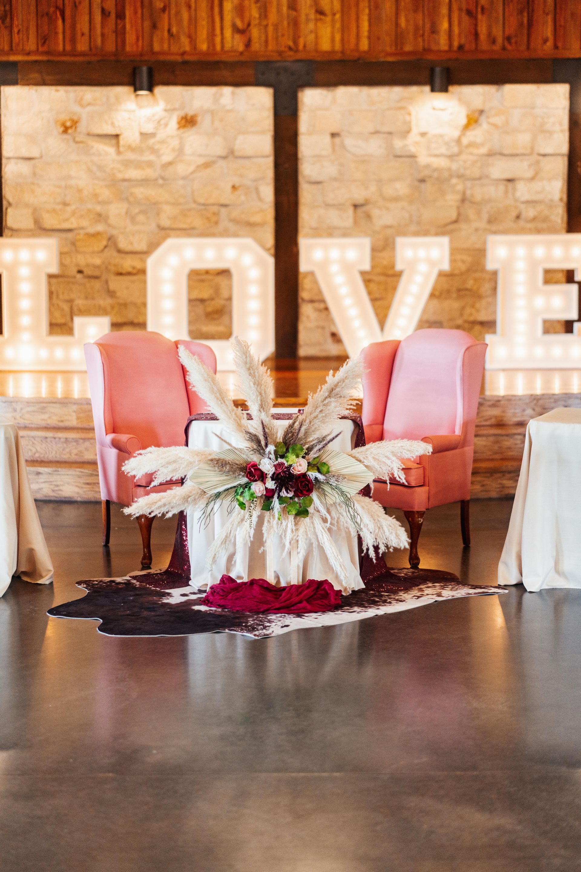 I have to admit, this was the first wedding of mine that took 'Western Chic' to its fullest potential. Jena's crafty mother DIY'd all of the decor herself; and I must say, she did so flawlessly! Let me put this into perspective for you: the decor showed up in a pull-behind trailer on the morning of the wedding. Inside were all of the floral decor, dressers, mirrors, cow hide rugs, his and hers pink chairs, 4 foot tall stair caps, and every other detail this mom thought up. The height of the pompous grass used everywhere really filled the ceremony and reception spaces well. This sweetheart table is admittedly one of my favorites to date. Another fun aspect was the choice of food. The couple decided to do a massive grazing table, which leads me to one of my favorite details of the day. The place settings were composed of mini charcuterie boards laid into napkins, and wrapped with ribbon. Jena didn't have a specific vision for the arrangements, so my team got to get creative with the assembly. I can easily say that between three of us, we meticulously spent just over an hour assembling and placing these at each guest's place.